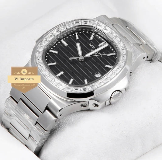 Patek Philippe Nautilus Diamond Bezel Black Dial Silver Strap Mad Watch Quartz Movement Dated Watch For Men's-Best Men's Collection PK-2139