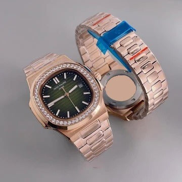 Patek Philippe Nautilus Diamond Bezel Green Dial Rose Gold Strap Mad Watch Quartz Movement Dated Watch For Men's-Best Men's Collection PK-2132