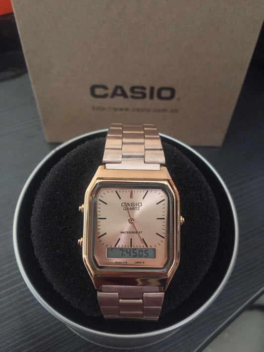 Casio Vintage Analog Black Digital Watch In Rose Gold Color And White Face Unisex Watch For Men's Women's Or Girls AQ-231-Best For casuals Watch For All