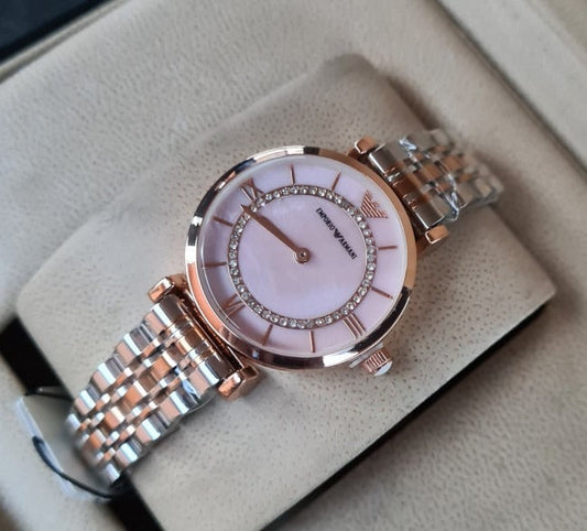 Emporio Armani Analog Machinsm Working Watch In Multi Color Strap And Pink Dial Stainless Steel Watch For Women's Or Girls Watch AR-1695