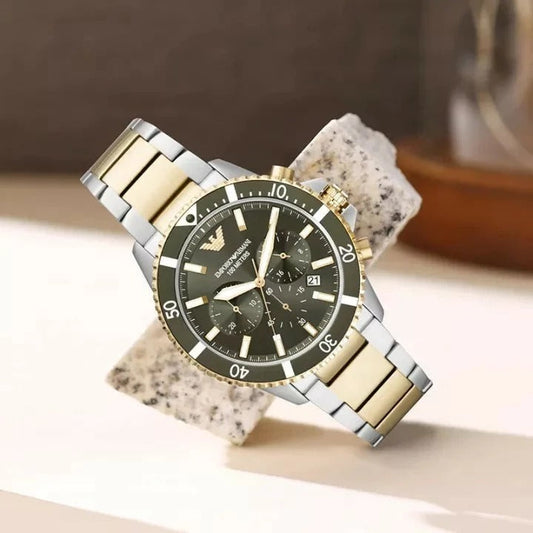 Emporio Armani New Design Set - Stainless Steel Silver With Golder Strip Colour With Black Dialer Watch For Men's -Best For Stylist Look- AR-2121