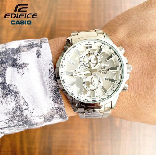 Casio Edifice Chronograph White World Design Dial Silver Metal Men's Watch EFR-305-best Gift
