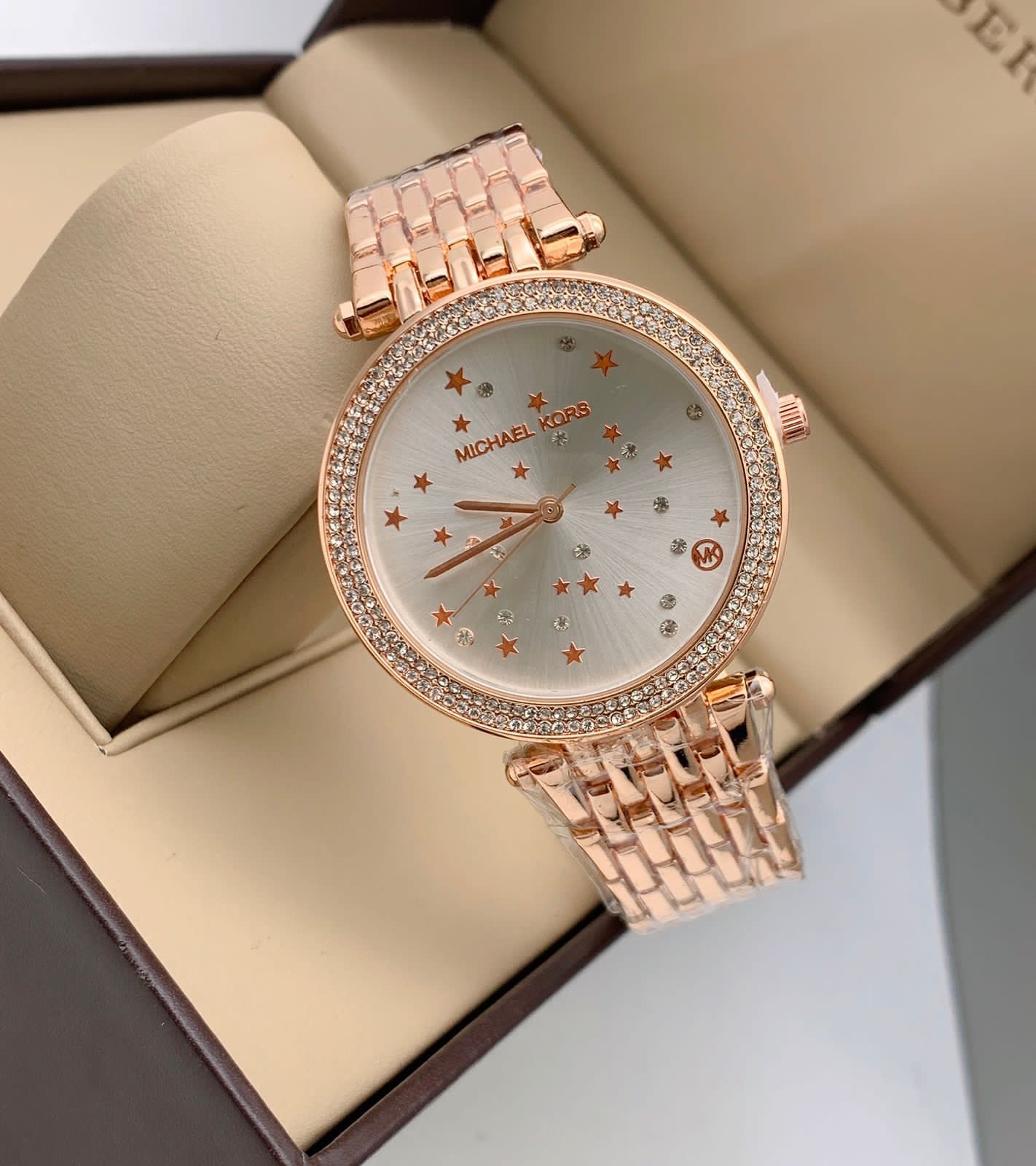 MK Golden Color Metal Diamond Case & Strap Watch For Women's MK-3726 Design Silver Dial For Girl Or Woman Best Gift Date Watch